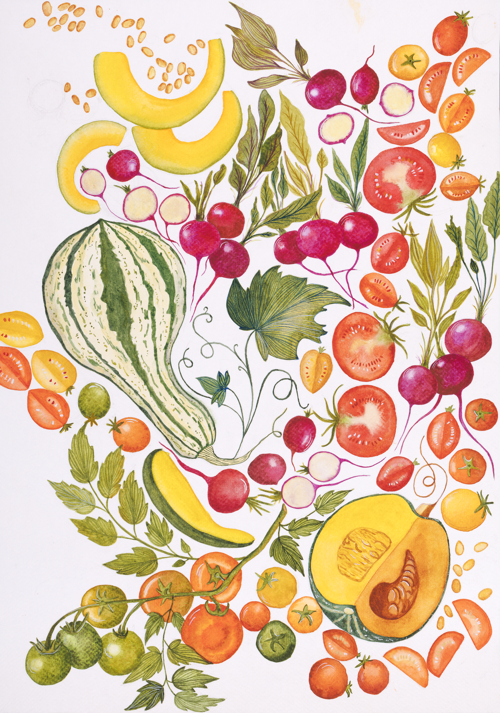 The painting is inspired by the colorful nature that surrounds us in summertime, with its abundance of delicious food that we could enjoy all day long. By painting the rich, vibrant shapes that food offers, I also explore the intensity of watercolor itself, and how its colors might evoke their taste to the viewer.